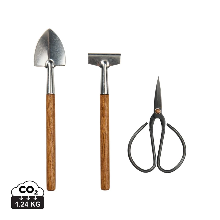 Zestaw narzędzi ogrodowych, w komplecie: łopatka, grabki i nożyczki do ziół, wykonane ze stali nierdzewnej, uchwyty z drewna akacjowego, w pudełku wykonanym z papieru z certyfikatem FSC®