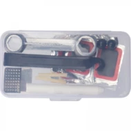 Zestaw narzędzi do naprawy roweru. W zestawie znajduje się listek papieru ściernego, klucz, 5 łatek, 2 wentyle, 2 nakrętki na wentyle oraz 2 łyżki do opon.