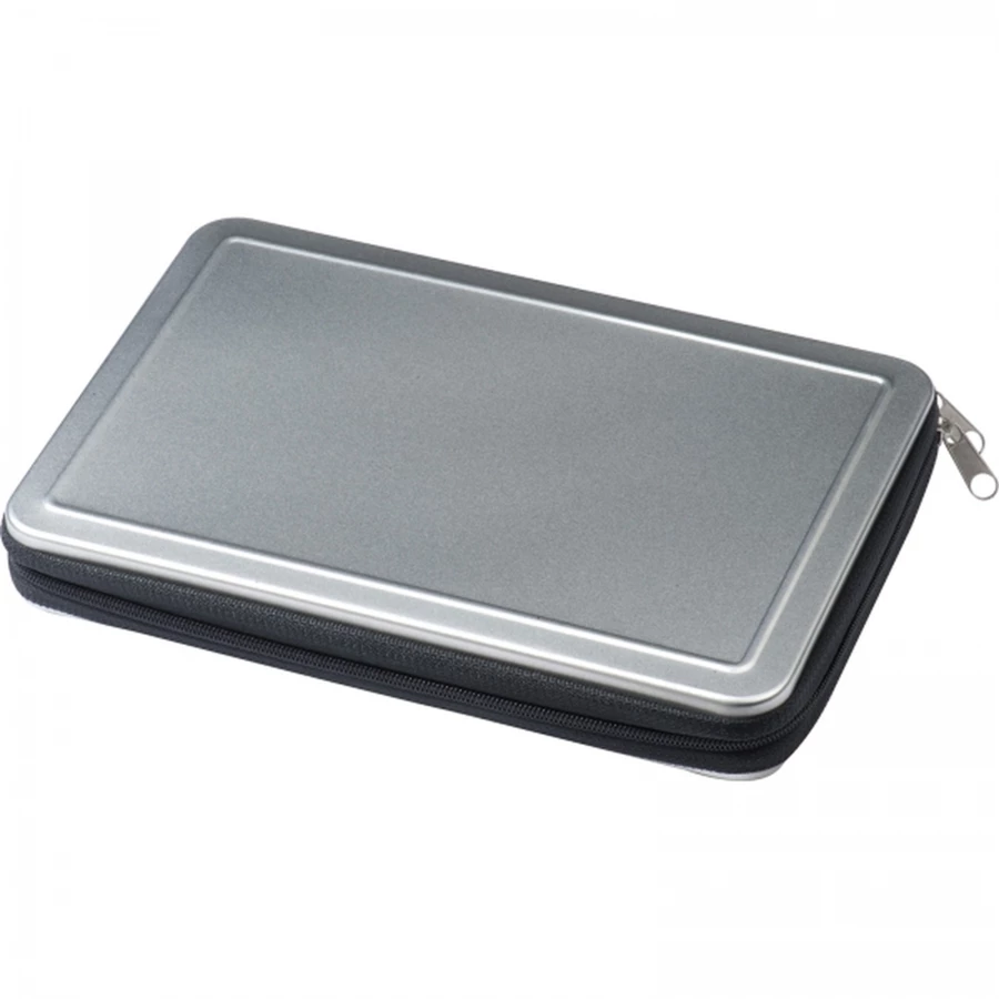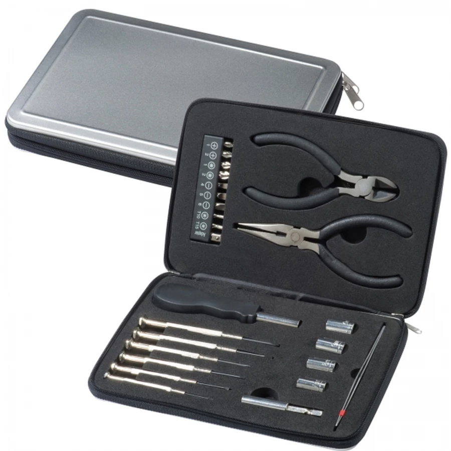 25-częściowy zestaw narzędzi w aluminiowym etui zamykanym na zamek, zawiera m.in.: szczypce, obcinaczki, zestaw wkrętaków precyzyjnych, uchwyt do bitów i nasadek, przedłużkę.