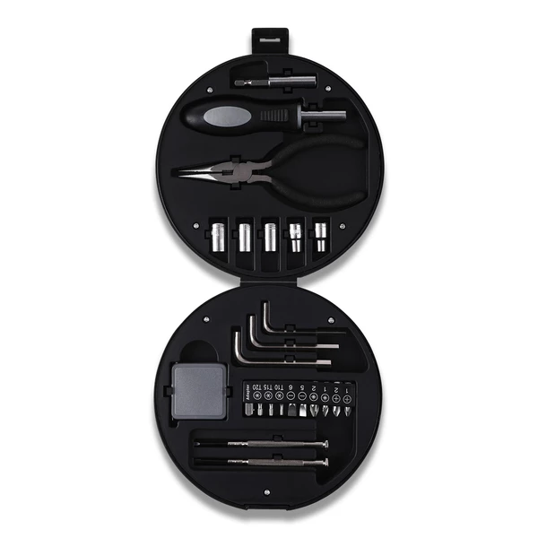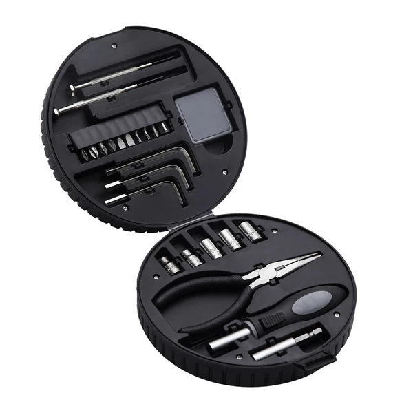 Zestaw 24 narzędzi w opakowaniu w kształcie opony samochodowej, w skład którego wchodzą: wkrętak precyzyjny PH (krzyżowy), wkrętak precyzyjny (płaski), miara zwijana 1 m, adapter (1/4”), klucz Torx – 3 rozmiary, wkrętak płaski – 2 rozmiary, wkrętak Phillips (krzyżowy) – 4 rozmiary, klucz imbusowy – 3 rozmiary, klucz nasadowy/oczkowy – 5 rozmiarów (5-9), szczypce uniwersalne, uchwyt wkrętakowy uniwersalny, magnetyczny (1/4”), przedłużka 35 mm (1/4”).