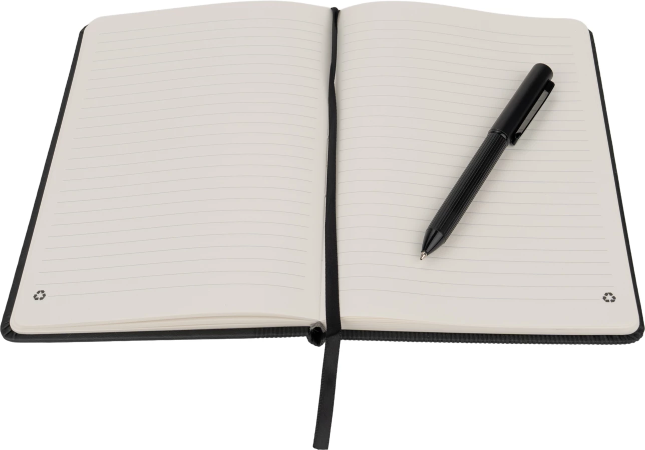 Zestaw od MoLu składający się z długopisu i notatnika ze 100 kartkami, wykonanymi z papieru z recyklingu.
