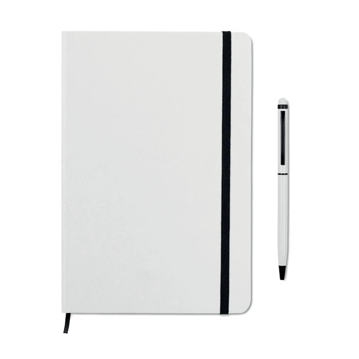 Notes A5 z długopisem z rysikiem 2 w 1. Twarda okładka. 144 strony w linie (72 kartki). Pasujący długopis z rysikiem do ekranów dotykowych. Niebieski tusz. Dopasowany elastyczny pasek zamykający i zakładka z tasiemki. FSC MIX CREDIT | P7.1 | FSC-C213206