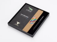 Zestaw ZENIX to idealny prezent dla osób lubiących eleganckie, a przy tym nieszablonowe przybory. W zestawie znajduje się notes wykonany z ekoskóry z elementem korkowym a także długopis z czarnym wkładem. Notes posiada 96 kartek w linie, zamykany jest na gumkę. Całość zapakowana jest w czarne, eleganckie pudełko.