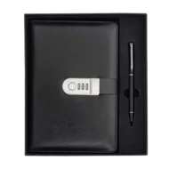 Elegancki czarny, 100 kartkowy notes w linie (80g/m2) w okładce z ekoskóry, wyposażony w zamek szyfrowy, w komplecie z długopisem. Wkład w kolorze niebieskim. Zapakowany w pudełko prezentowe.