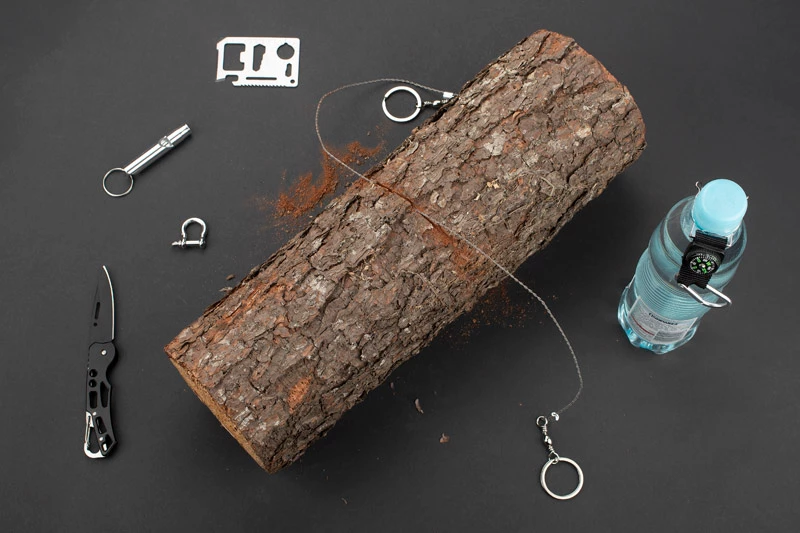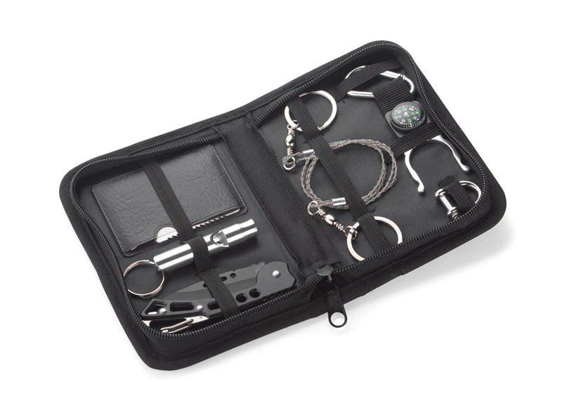 Zestaw outdoor BALE to gratka dla miłośników survivalu. W jednym zestawie znajdziemy wszystko co sprawdzi się podczas niejednej wyprawy. Zestaw składa się z sześciu elementów: uchwytu na butelkę z karabińczykiem i kompasem, ręcznej piły łańcuszkowej, składanego noża, gwizdka, szekli żeglarskiej i karty survivalowej która posiada aż 11 funkcji: otwieracza do puszek, butelek, śrubokrętu, linijki 4cm, klucza czteropozycyjnego do różnych rozmiarów nakrętek czy śrub, otwieracza motylkowego, piłki dwurzędowej, wskaźnika mapowego, klucza dwupozycyjnego i otworu na smycz lub kółko do kluczy. Zestaw pakowany jest w czarne etui.