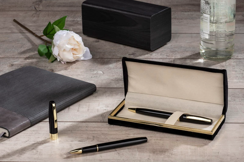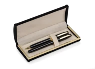 Komplet piśmienniczy ARIZONA ze złotymi wykończeniami pakowany jest w eleganckie etui wykonane z czarnego weluru. W zestawie znajduje się długopis z niebieskim wkładem oraz pióro kulkowe (rollerball) z czarnym wkładem. Logo grawerujemy w kolorze złotym na górnej części obu elementów zestawu, co nadaje im spójny i prestiżowy charakter.
