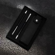 Zestaw składający się z aluminiowego długopisu i pióra kulkowego wyposażonych w końcówkę do obsługi ekranów dotykowych, pakowanych w etui z ekoskóry. Chromowane dodatki. Wkład do długopisu o średnicy 1,00 mm w kolorze niebieskim, nabój o średnicy 0,7 mm do pióra kulkowego także w kolorze niebieskim. Pakowany w czarne opakowanie upominkowe.