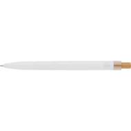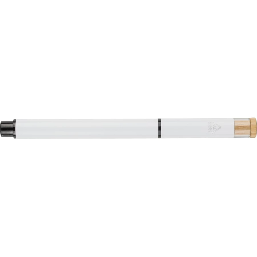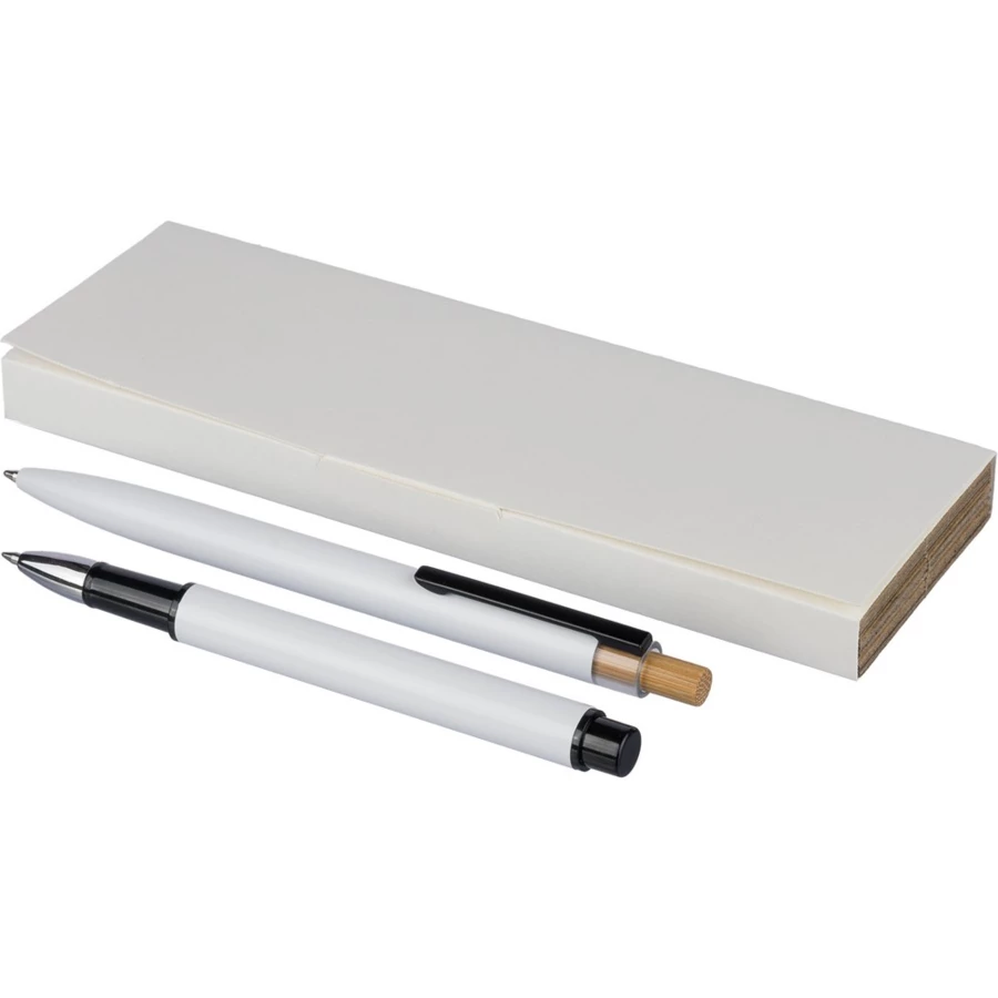 Zestaw piśmienniczy, w którego w skład wchodzi: długopis z bambusowym przyciskiem, ikoną recyklingu na produkcie, metalowym klipsem, tusz w niebieskim kolorze, wystarczający na ok. 700 m pisania, pióro kulkowe z pokrywką, metalowym klipsem, ikoną recyklingu na produkcie, wkład w niebieskim kolorze, wystarczający na ok. 500 m pisania, zapakowany w kolorowe pudełko upominkowe z recyklingu, produkt wykonany z aluminium z recyklingu, RPET i metalu
