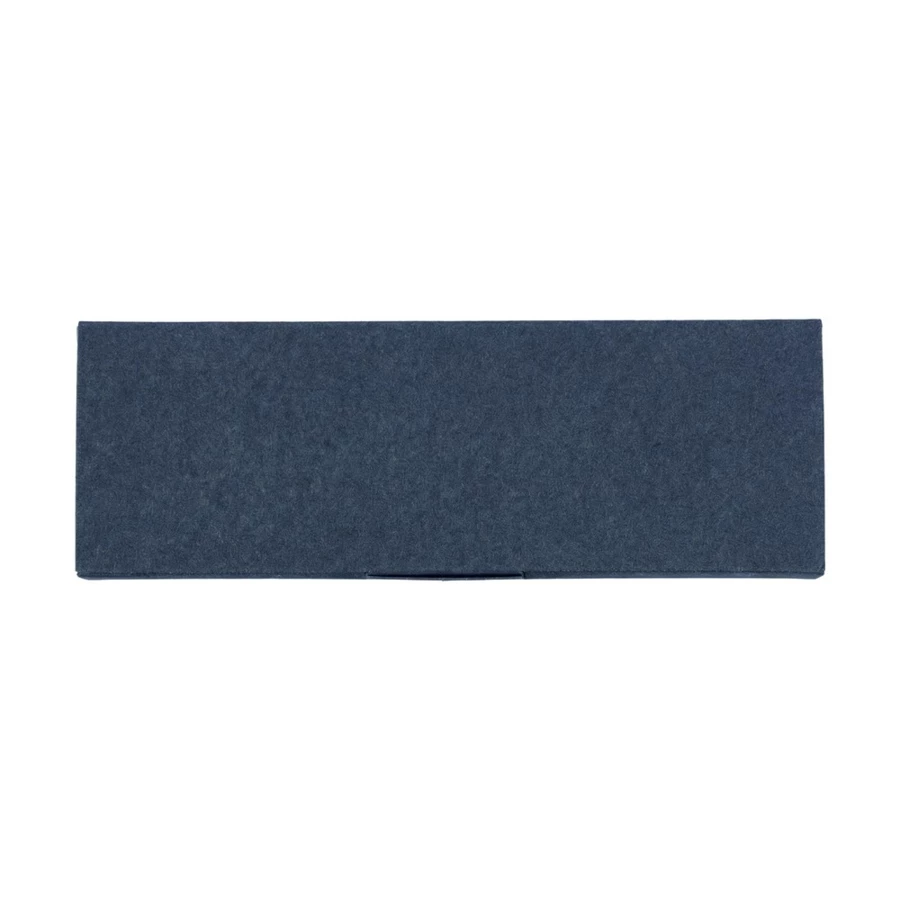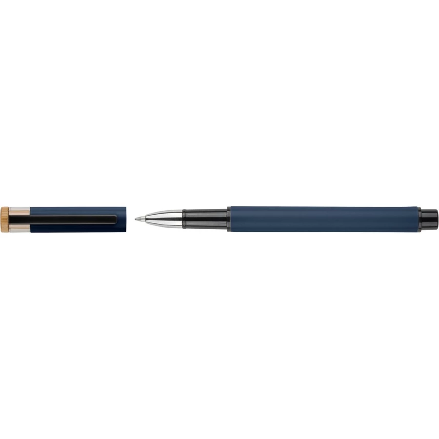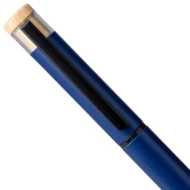 Zestaw piśmienniczy, w którego w skład wchodzi: długopis z bambusowym przyciskiem, ikoną recyklingu na produkcie, metalowym klipsem, tusz w niebieskim kolorze, wystarczający na ok. 700 m pisania, pióro kulkowe z pokrywką, metalowym klipsem, ikoną recyklingu na produkcie, wkład w niebieskim kolorze, wystarczający na ok. 500 m pisania, zapakowany w kolorowe pudełko upominkowe z recyklingu, produkt wykonany z aluminium z recyklingu, RPET i metalu