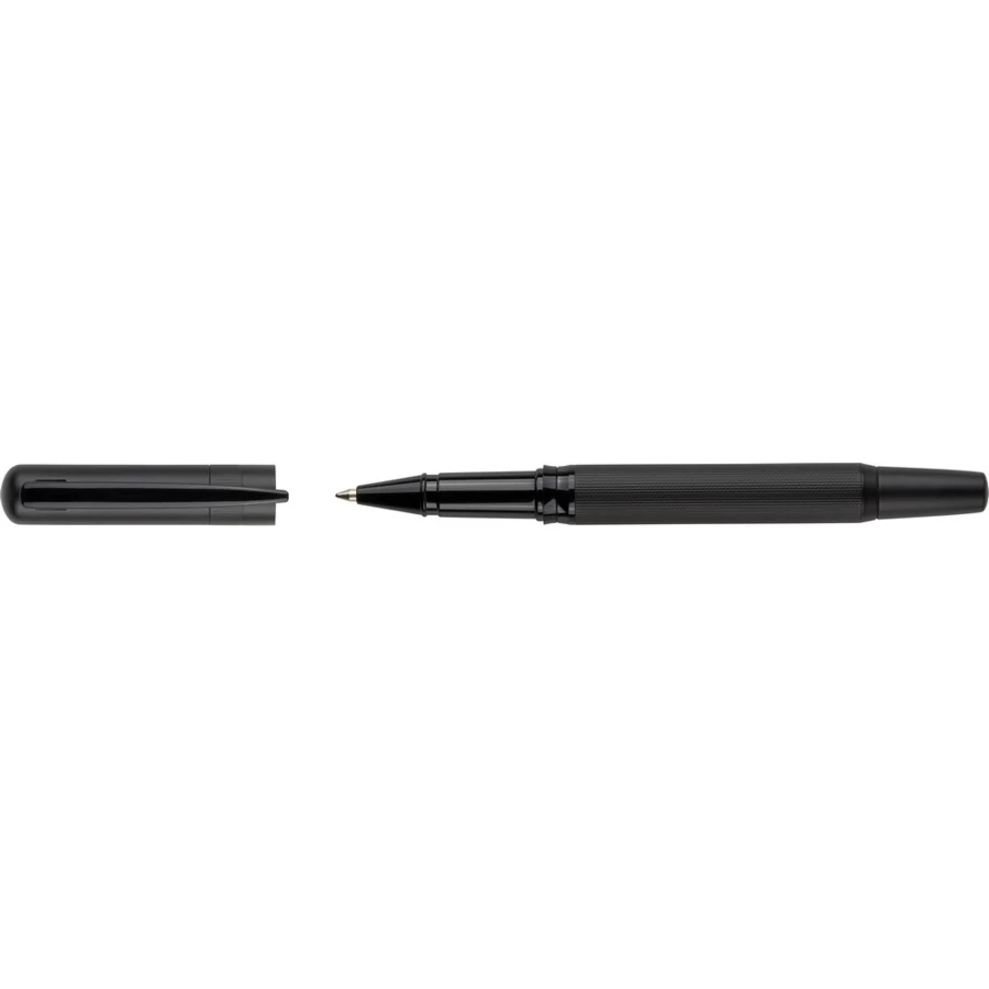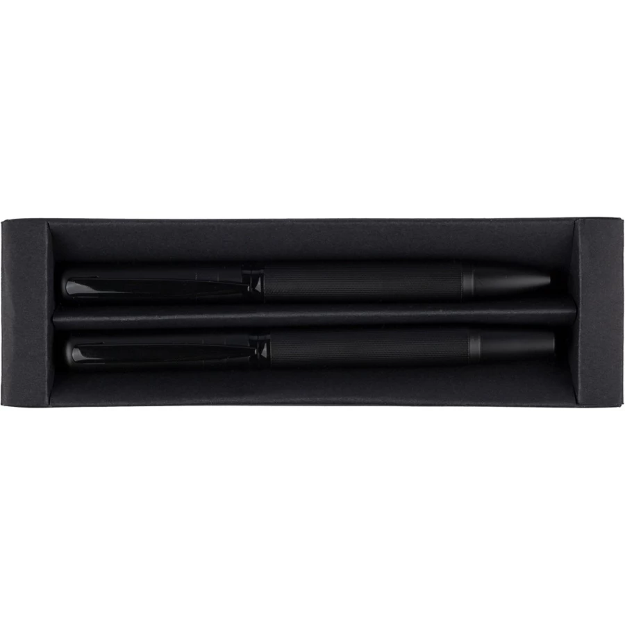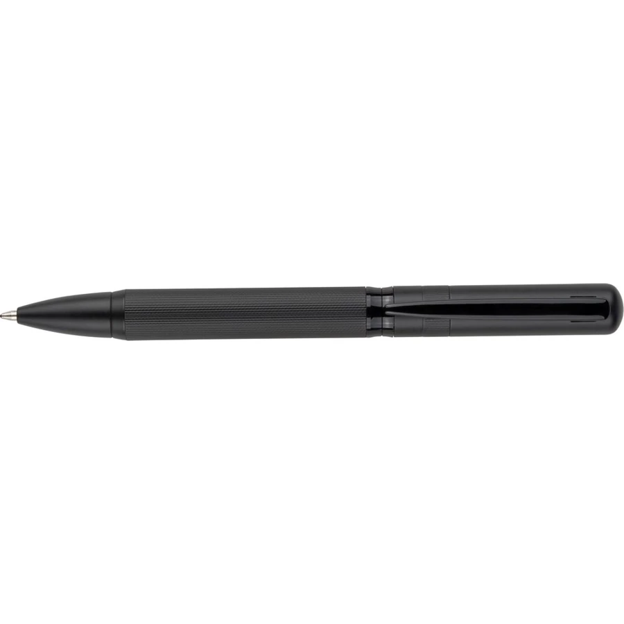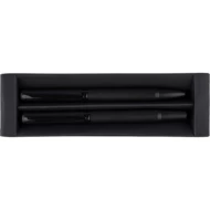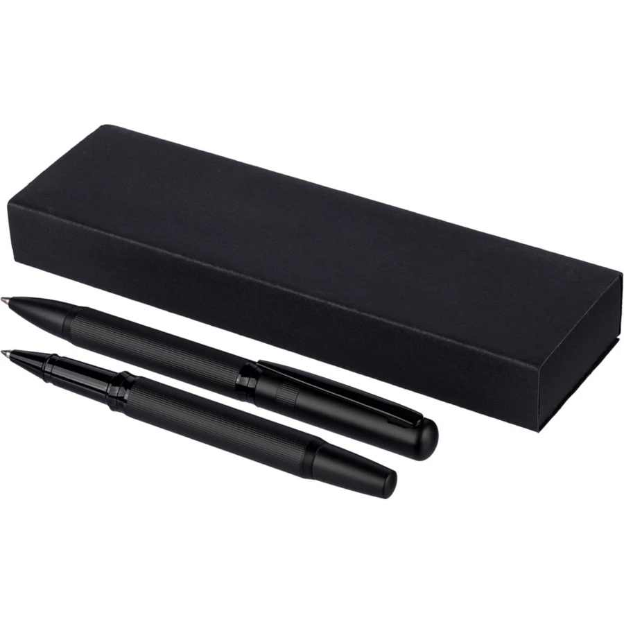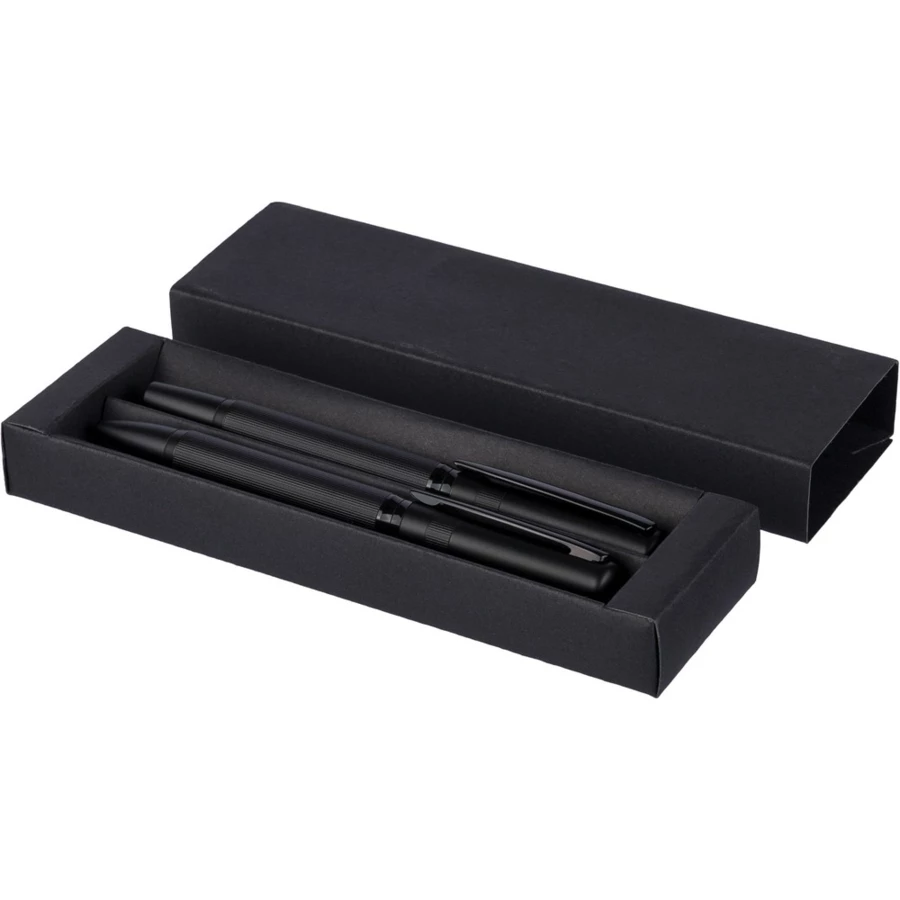 Zestaw piśmienniczy, zawiera długopis z niebieskim tuszem ok. 1000 m pisania, pióro kulkowe ok. 400 m pisania, zapakowany w czarny kartonik, produkt wykonany z metalu,