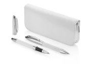 Komplet piśmienniczy: długopis i pióro kulkowe w etui z materiału skóropodobnego (PU). Długopis i pióro kulkowe z wkładami w kolorze niebieskim. Logo wygrawerujemy na artykułach piśmienniczych.
