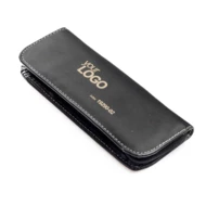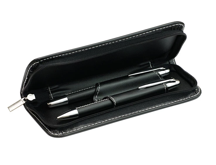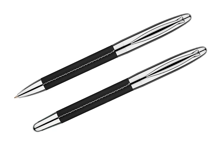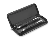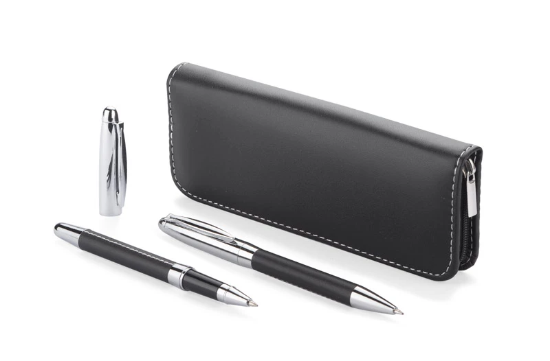 Komplet piśmienniczy Elegance: długopis i pióro kulkowe w etui z materiału skóropodobnego (PU). Długopis i pióro kulkowe z wkładami w kolorze niebieskim. Logo wygrawerujemy na artykułach piśmienniczych.