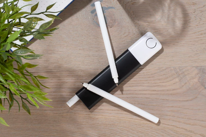 HOP to praktyczny zestaw piśmienniczy zawierający niezbędne akcesoria zapakowane w innowacyjne etui z tworzywa sztucznego. Długopisy umieszczone wewnątrz trzymane są przez specjalny mechanizm, który uniemożliwia ich wypadanie. Naciśnięcie przycisku znajdującego się na dole etui zwalnia blokadę i umożliwia wyjęcie długopisów. W zestawie znajduje się długopis w kolorze niebieskim, długopis w kolorze czerwonym oraz ołówek wieczny niewymagający temperowania. Całość wykonana została z tworzywa sztucznego, dzięki czemu zestaw jest niezwykle lekki. HOP to idealny prezent dla nauczycieli, studentów i uczniów, który zmieści się w każdej torebce i plecaku