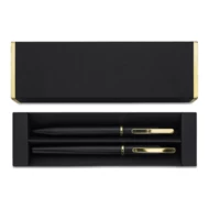 Elegancki zestaw upominkowy składający się z metalowego długopisu i pióra kulkowego. Możliwość wygrawerowania błyszczącego logo, pasującego kolorem do metalowych detali długopisu. Niebieski wkład.