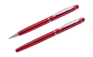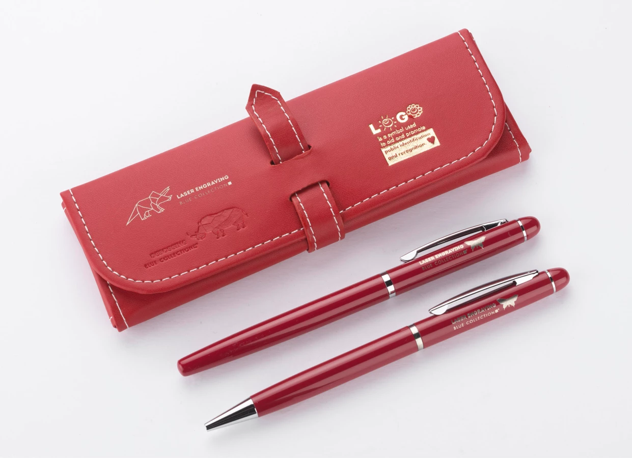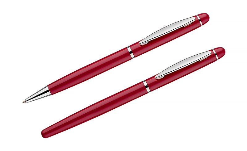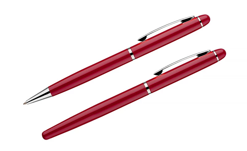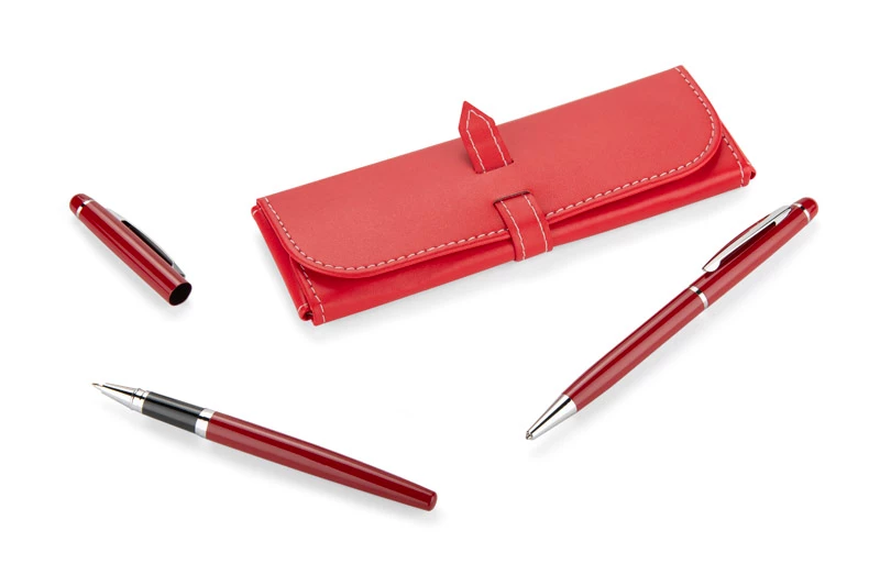 Elegancki zestaw piśmienniczy pakowany w etui z materiału skóropodobnego (PU). W zestawie znajdują się długopis oraz pióro kulkowe. Logo wygrawerujemy na powierzchni artykułów piśmienniczych.