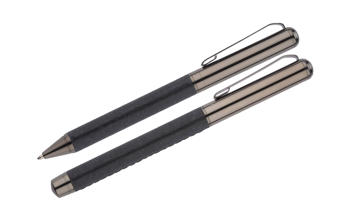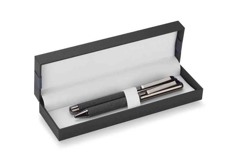 Zestaw OHIO to propozycja eleganckiego kompletu piśmienniczego nawiązującego do eko trendów. Metalowy korpus długopisów został wykończony naturalną skórą z recyklingu. Chromowane wykończenia świetnie komponują się z naturalnym surowcem na korpusie. W zestawie długopis oraz pióro kulkowe. Wkłady w kolorze niebieskim. Zestaw zapakowany w gustowne pudełko wykonane z papieru. Wieczko ozdobione skórą z recyklingu.