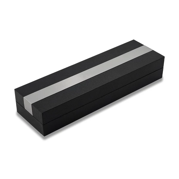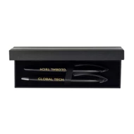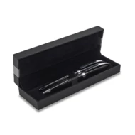 Elegancki zestaw składający się z metalowego długopisu i pióra kulkowego. Wkłady w kolorze niebieskim. Obrotowy mechanizm włączania. Zapakowany w eleganckie pudełko.