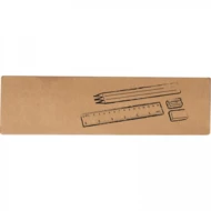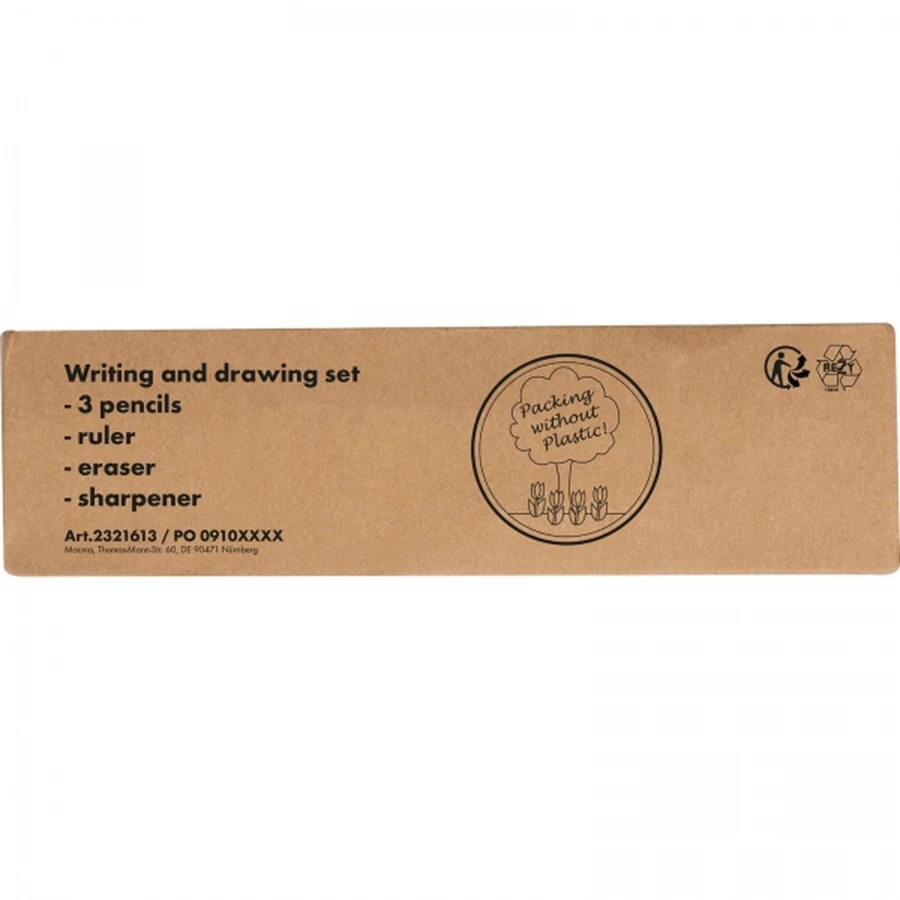 Drewniany zestaw piśmienniczy wyposażony w 3 ołówki o różnej twardości, gumkę do zmazywania, linijkę oraz temperówkę. Całość zapakowana w tekturowy kartonik z okienkiem.