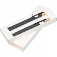 Zestaw piśmienny składający się z piszącego na niebiesko długopisu i pióra kulkowego, wykonany z aluminium z recyklingu. Całość zapakowana w pudełko.