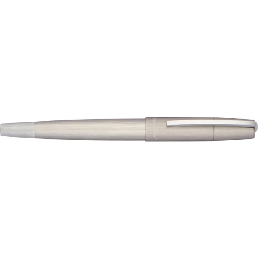 Zestaw piśmienniczy wykonany z matowego szczotkowanego metalu. Zestaw składa się z przekręcanego długopisu z niebieskim wkładem oraz pióra kulkowego.