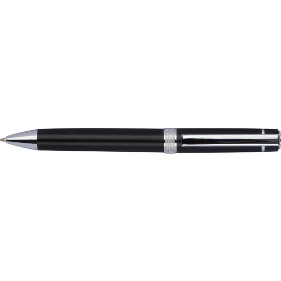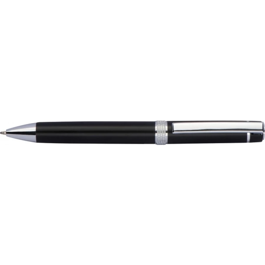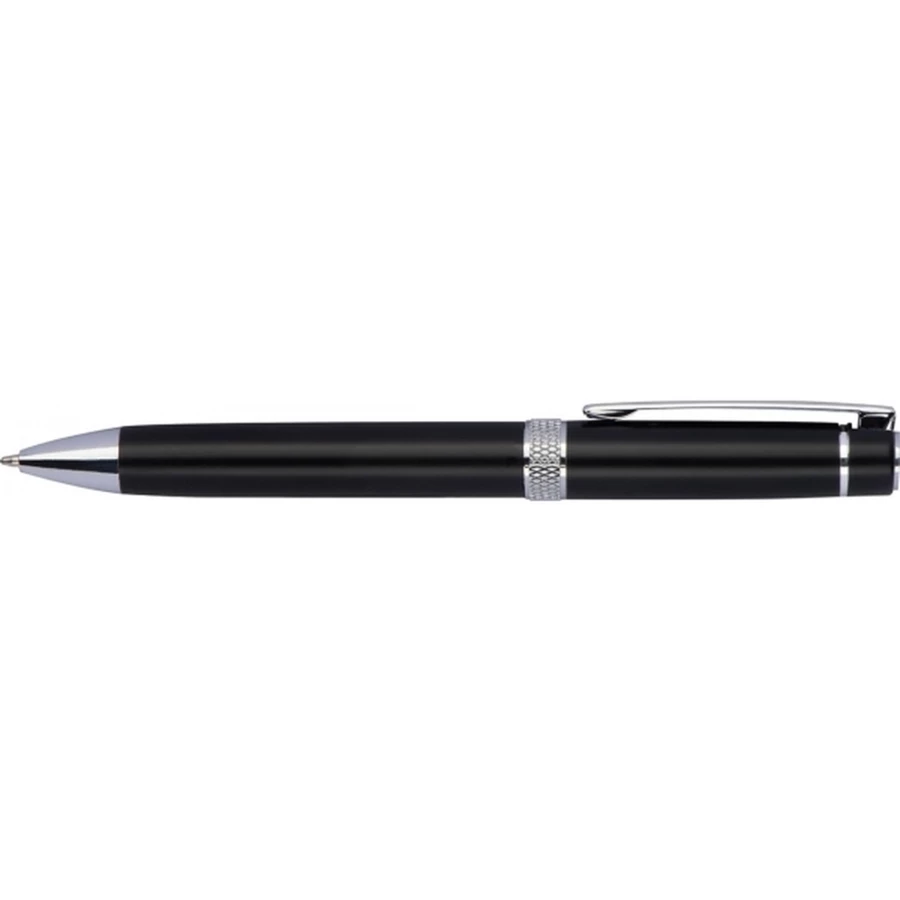 Zestaw piśmienniczy składający się z metalowego długopisu z niebieskim wkładem oraz pióra kulkowego. Całość zapakowana w grafitowe etui.