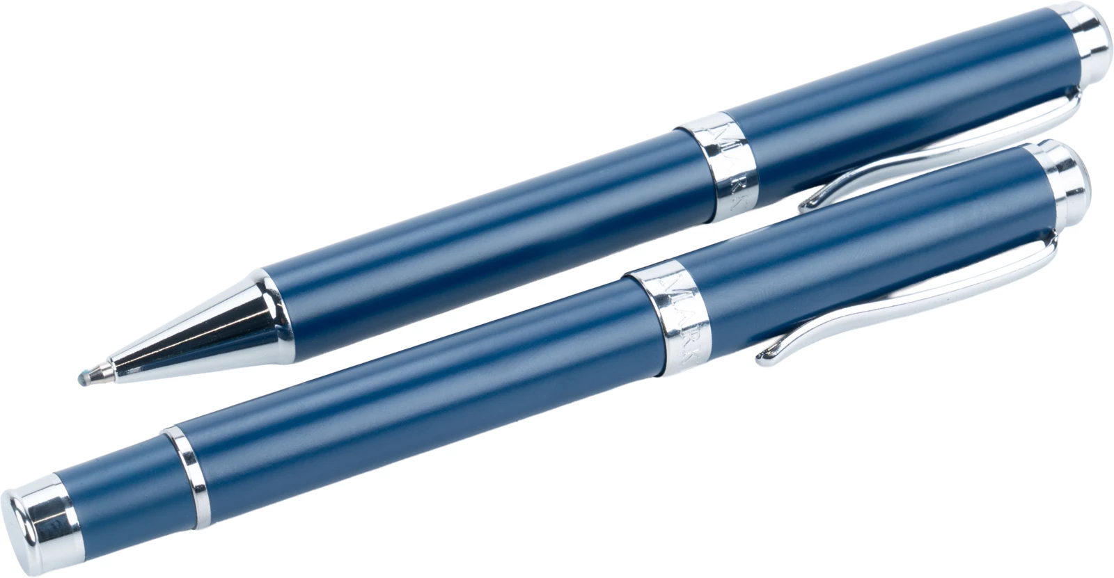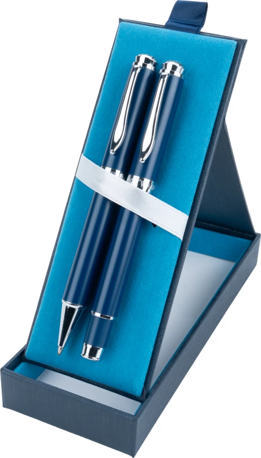 Ekskluzywny zestaw do pisania, składający się z długopisu (o zasięgu pisania 1200 m)oraz pióra kulkowego (o zasięgu 400 m), wyposażonych w niebieski wkład, zapakowanych w eleganckie etui.