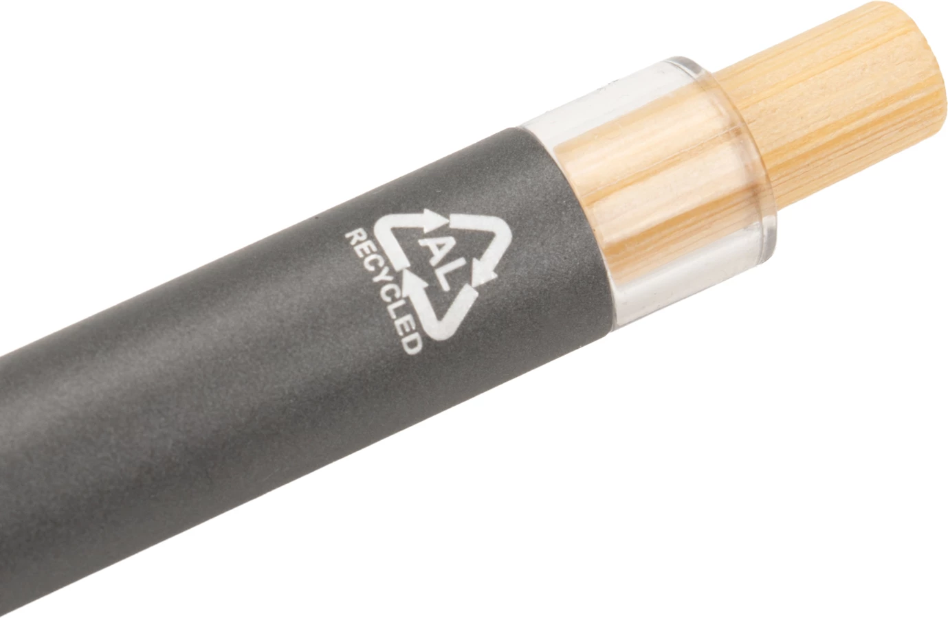 Zestaw piśmienny składający się z długopisu półżelowego, piszącego na niebiesko i ołówka automatycznego. Przybory piśmienne wykonane z aluminium pochodzącego z recyklingu, zapakowane w przyjazne środowisku pudełko.