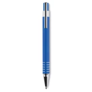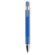 Aluminiowy zestaw do pisania: przyciskany długopis z niebieskim wkładem i mechaniczny ołówek, w dobranym kolorystycznie metalowym pudełku.