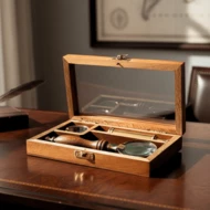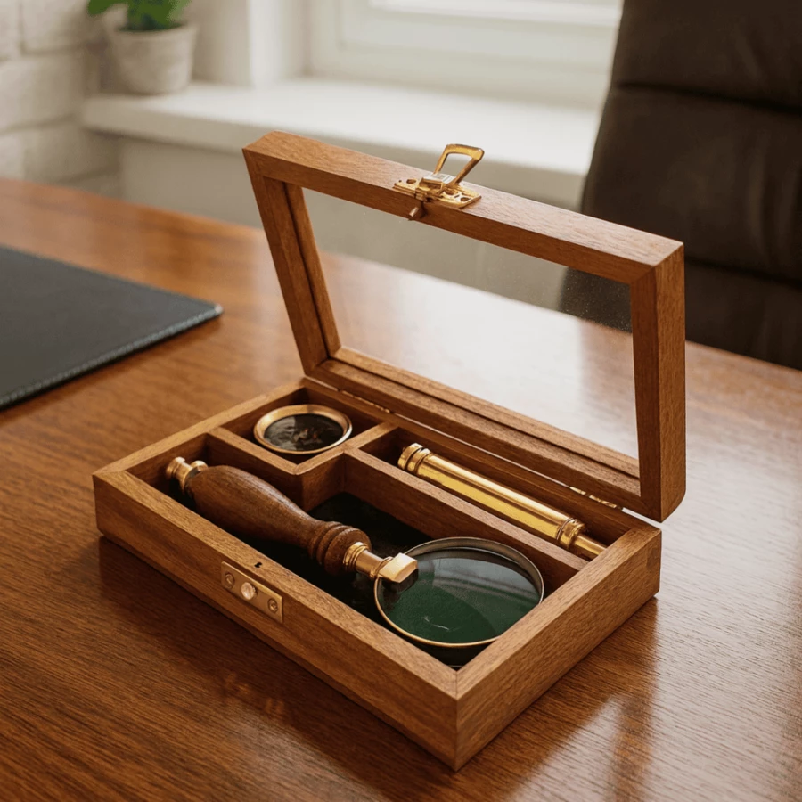 ?Styl Vintage Premium: Mosiężne, złociste wykończenie wszystkich elementów oraz drewniane detale (lupa, pudełko) idealnie oddają klimat retro.