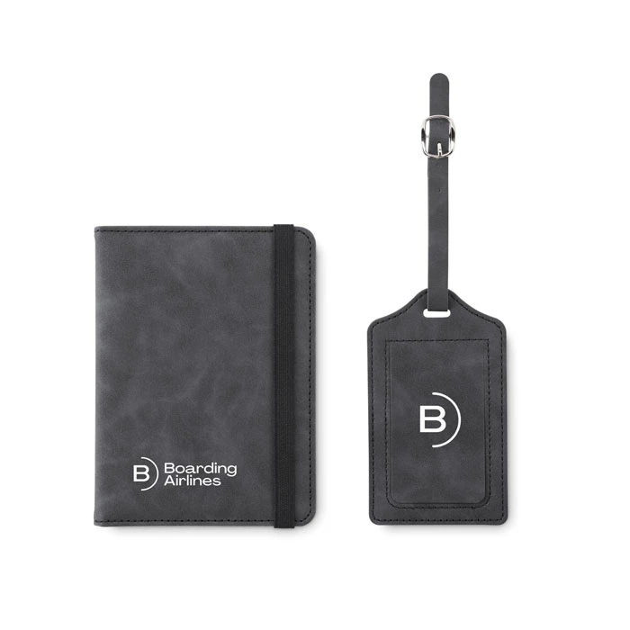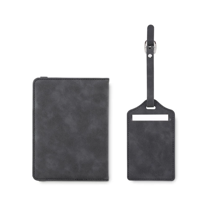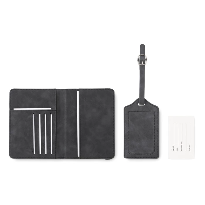 Zestaw podróżny z etui na paszport i z przywieszką bagażową z PU. Całość w pudełku upominkowym.