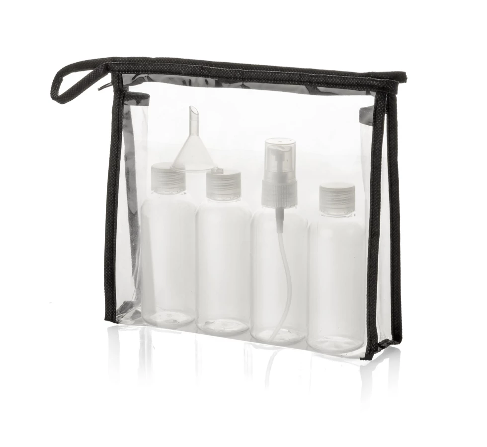 Zestaw podróżnych pojemników to gadżet przydatny w czasie podróży. Pozwala na zabranie swoich ulubionych kosmetyków w mniejszych buteleczkach. Zestaw zawiera 4 buteleczki o pojemności 80 ml, w tym jedną ze spryskiwaczem oraz lejek ułatwiający przelewanie kosmetyków.