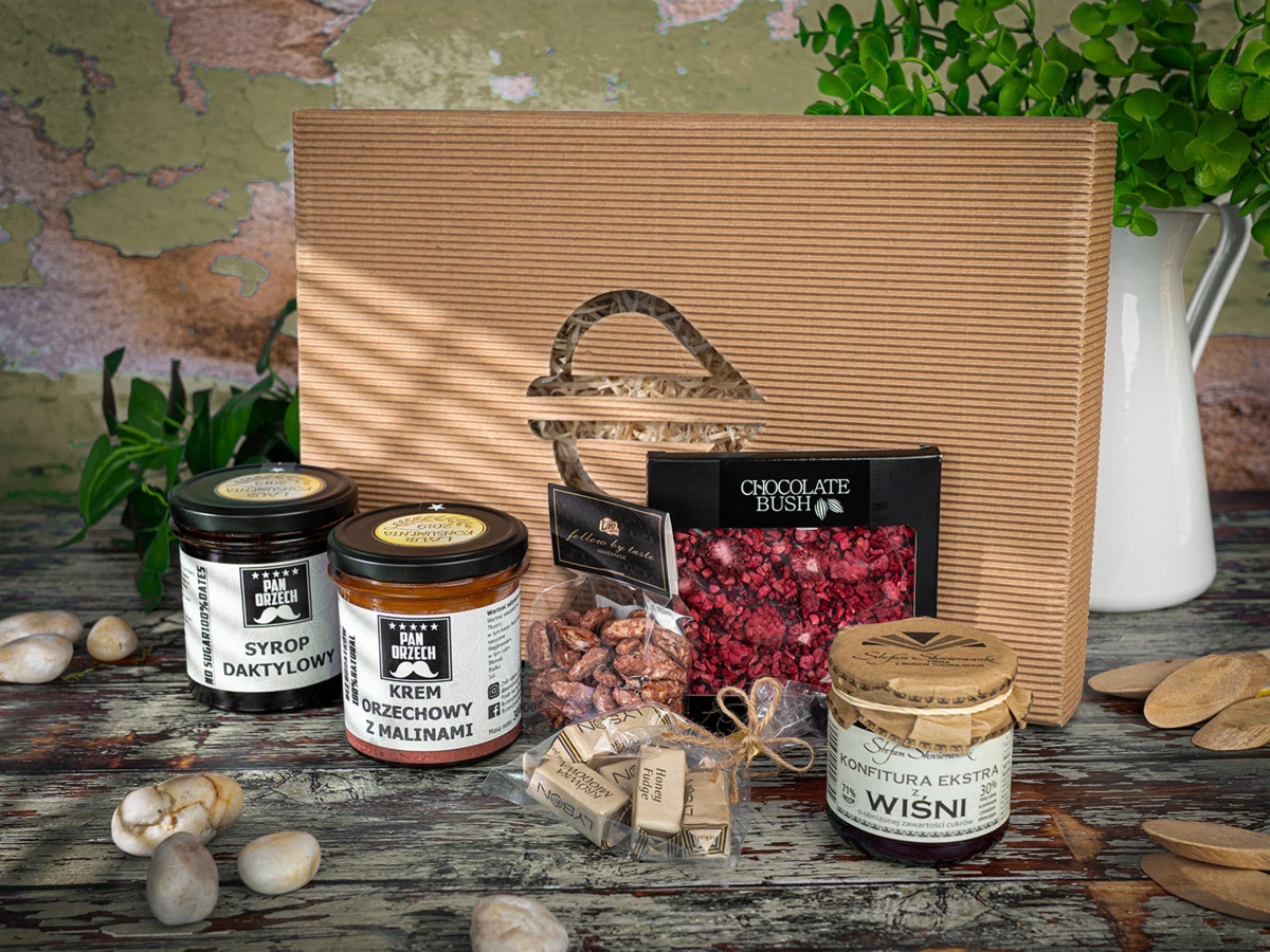 W przypadku braku dostępności produktów z oferty zastrzegamy sobie prawo do zamiany produktów na równowartościowe; zawsze po wcześniejszej akceptacji przez Klienta. Owocowy raj to paczka pełna naturalnych smaków, idealna dla smakoszy! Zawiera konfiturę extra z wiśni (200 g), mleczną czekoladę z liofilizowanymi malinami (85 g), syrop daktylowy (400 g), krem orzechowy z malinami (300 g), miodowe krówki (70 g) oraz prażone orzechy nerkowca (70 g). Całość zapakowana w eleganckie opakowanie, gotowa na prezent lub do delektowania się!