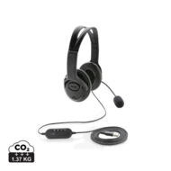 Zestaw słuchawkowy, wykonany z ABS, lekki i wygodny, wbudowany mikrofon, wbudowany panel do zmiany głośności / wyciszenia, nadają się idealnie do rozmów video, kompatybilne z komputerami PC oraz Mac®, zintegrowany kabel z końcówką USB A o długości 2 m, ślad węglowy produktu: 1,37 kg CO2