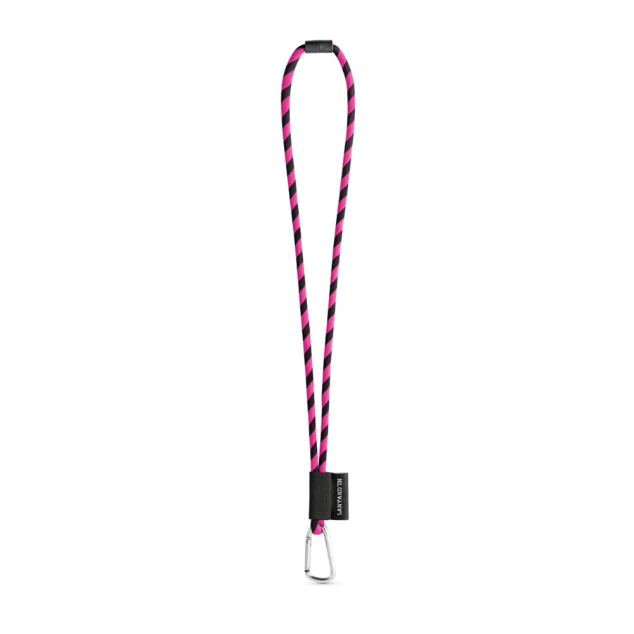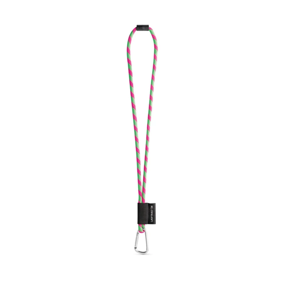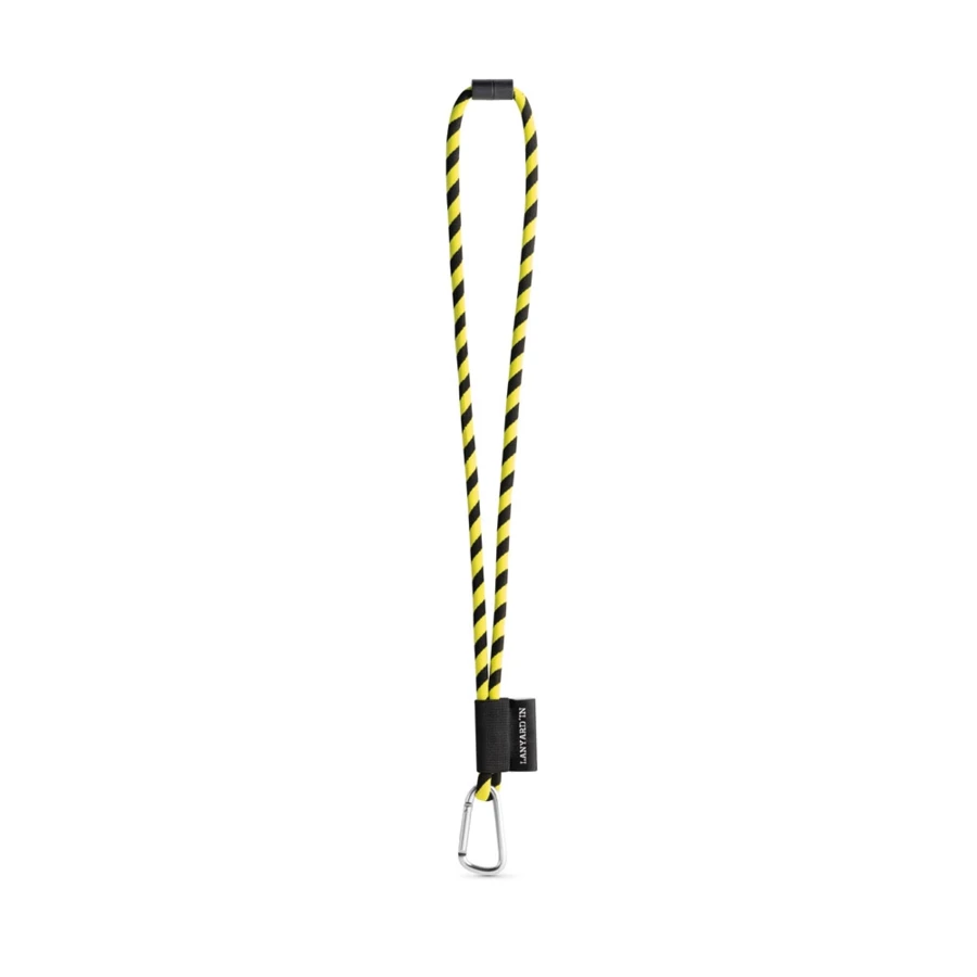 Personalizowana smycz Lanyard, długa smycz sznurkowa z poliamidu, w 17 standardowych kolorach dostępnych do personalizacji. Zawiera następujące akcesoria i dodatki: czarna gumka, etykieta sublimacyjna 43 x 22 mm, metalowy haczyk 55 mm i zamek bezpieczeństwa ø6 mm. ø7 x 470 mm