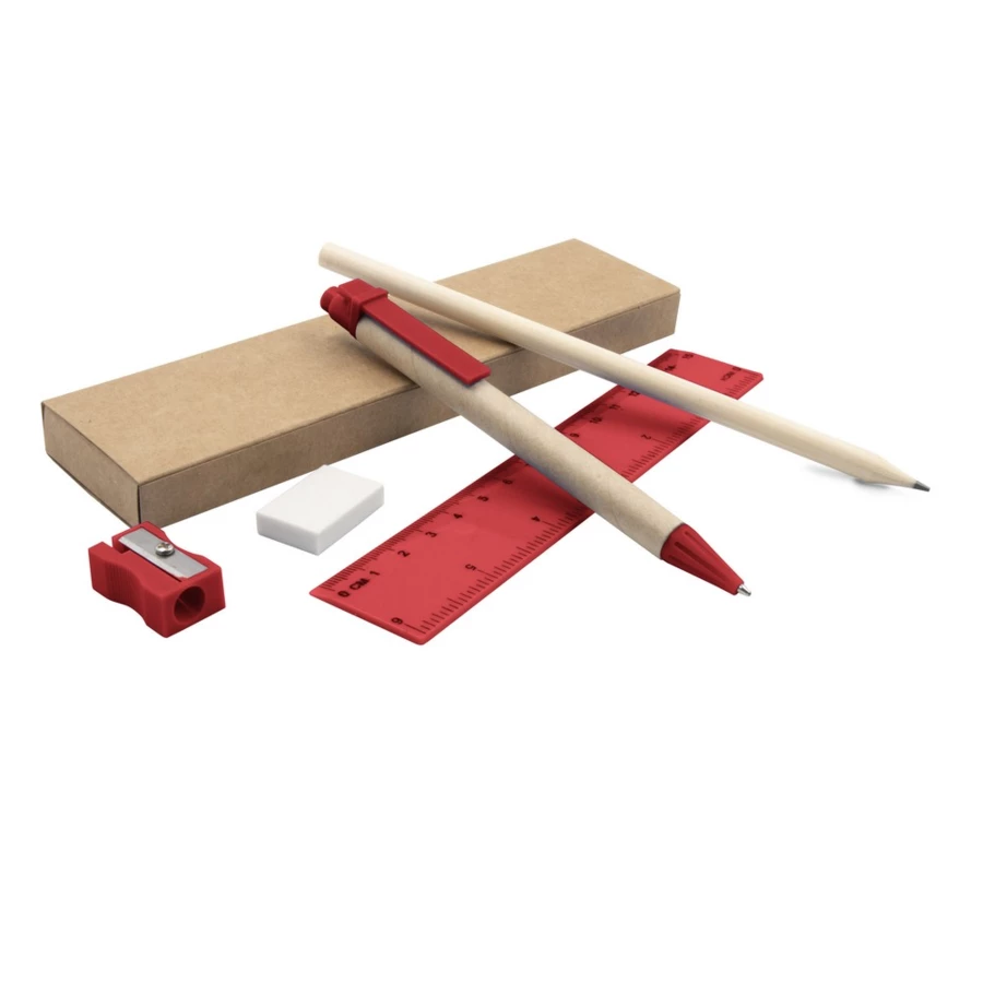 Zestaw szkolny w pudełku, w komplecie znajduje się: ołówek, długopis z trzonem z kartonu z recyklingu (wkład w niebieskim kolorze), linijka (15 cm / 6 cali), gumka oraz temperówka, produkt wykonany z kartonu z recyklingu