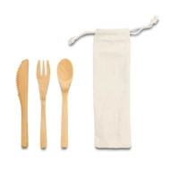 Sztućce bambusowe mogą być ekologicznym zamiennikiem sztućców plastikowych. Zestaw składa się z łyżki, widelca i noża zapakowanych w bawełniany woreczek. Przydatny w podróży, szkole, piknikach oraz biurze.