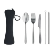 Zestaw sztućców ze stali nierdzewnej wielokrotnego użytku, w tym widelec, nóż, łyżka, słomka i szczotka w etui z neoprenu.