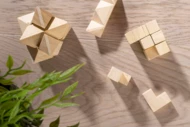 Zestaw ekologiczny trzech układanek logicznych. Zestaw pakowany w skrzyneczkę, wykonany z drewna.