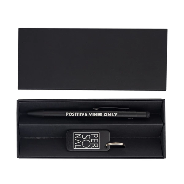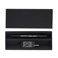 Zestaw promocyjny składający się z długopisu i breloczka wykonanych z aluminium pochodzącego z recyklingu. Całość zapakowana w czarne, kartonowe pudełko. Długopis z niebieskim wkładem.
