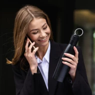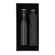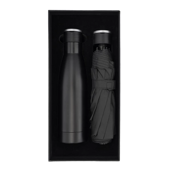 Biznesowy zestaw składający się z butelki próżniowej oraz parasola. Całość zapakowana w eleganckie czarne pudełko. Butelka próżniowa o podwójnych ściankach ze stali nierdzewnej, ze składanym uchwytem. Pojemność 500 ml. Parasol wykonany z materiału RPET 190T pongee, żebra wykonane z włókna szklanego. Pakowany w wodoodporne etui.