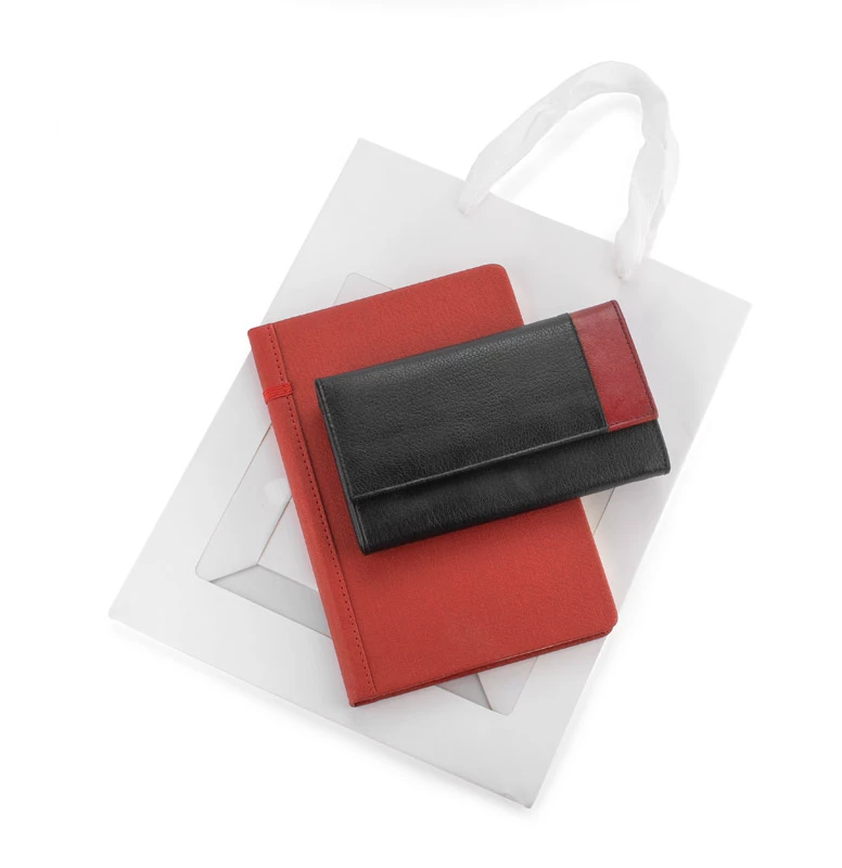 Zestaw upominkowy HER to propozycja idealna dla Pań. Jest estetyczny i gustowny. W skład zestawu wchodzi portfel, notes i torebka prezentowa. Portfel wykonany jest ze skóry naturalnej w kolorze czarnym z czerwoną wstawką, która sprawia że portfel wygląda bardzo ciekawie i nietuzinkowo. Posiada zewnętrzną kieszeń zamykaną na zamek. Wewnątrz znajduje się 5 zakładek na karty kredytowe, 5 przegródek na dokumenty oraz kieszonka zapinana na zamek. Notes wykonany jest z materiału skóropodobnego (PU). Posiada twardą oprawę wykończoną przyjemną w dotyku fakturą. Całość zestawu możemy zapakować w dołączoną torebkę prezentową. Pięknie wyeksponuje zapakowany w nią prezent. Torebka wykonana jest z papieru.