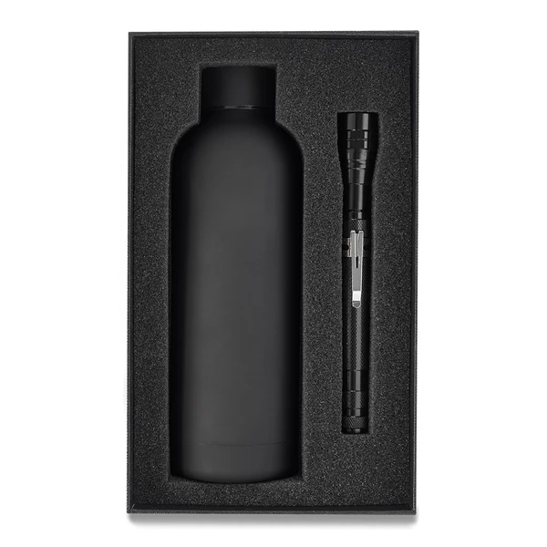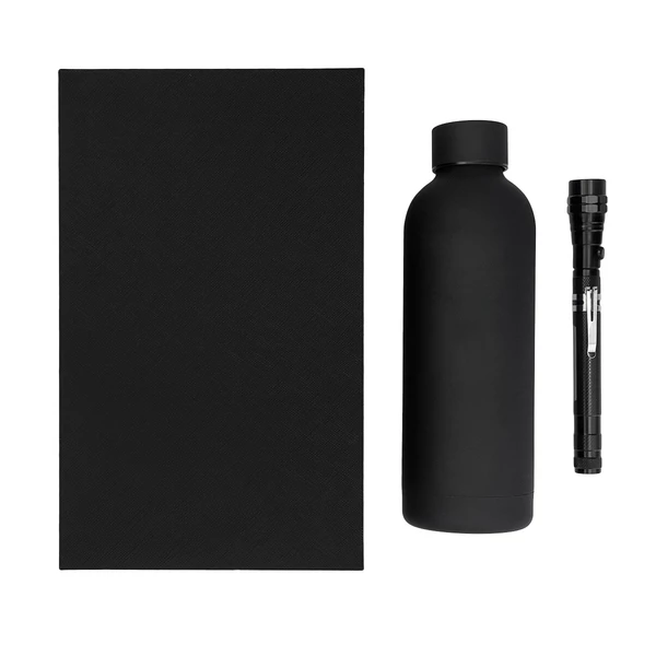 Zestaw upominkowy składający się z butelki próżniowej i latarki. Butelka o pojemności 500 ml. Wewnętrzna ścianka wykonana ze stali o podwyższonej jakości 18/8, ścianka zewnętrzna wykonana ze stali 18/0 o przyjemnym w dotyku wykończeniu. Utrzymuje temperaturę powyżej 40°C do 15 godzin. Metalowa wysuwana latarka. Teleskop o długości 38,5 cm. Wyposażona w 3 białe diody LED, 10 lumenów. Zaopatrzona w klips oraz magnesy na obu końcach. Zasilana 4 bateriami typu AG13 (w zestawie). Całość w eleganckim upominkowym pudełku.