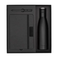 Biznesowy zestaw składający się z butelki próżniowej, notesu i długopisu. Całość zapakowana w eleganckie, czarne pudełko. Butelka próżniowa ze stali nierdzewnej o podwójnych ściankach (stal 18/8 wewnątrz, 18/0 na zewnątrz), ze składanym uchwytem. Utrzymuje temperaturę powyżej 40°C do 15 godzin. Pojemność 500 ml. Notatnik formatu A5, twarda okładka z tkaniny RPET, ozdobiona czarnym metalowym elementem; 80 kartek w kratkę, o gramaturze 70 g/m². Metalowy długopis ozdobiony tkaniną RPET. Niebieski wkład 1,0 mm.