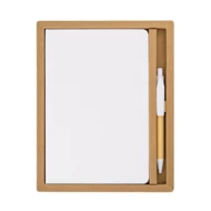 Zestaw składający się z notesu A5 w linie i długopisu. Notes w twardej oprawie z tasiemką do zaznaczania zapisanej ostatniej strony i elastyczną gumką chroniącą wnętrze. 80 kartek w kolorze kremowym (papier 70 g/m2). Bambusowy długopis, wyposażony w niebieski wkład. Zestaw pakowany jest w brązowe pudełko.