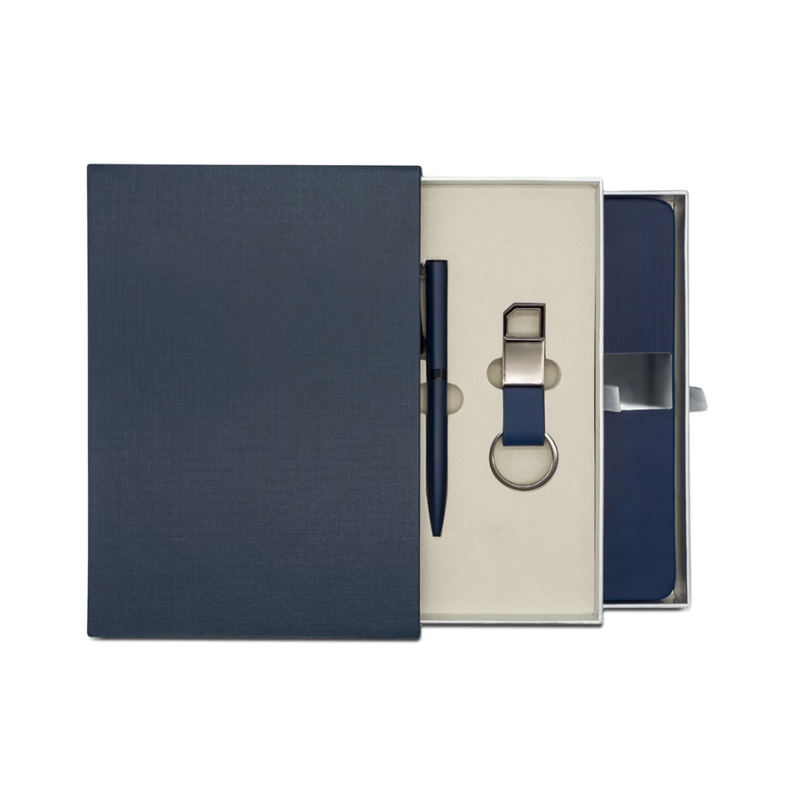 Zestaw składający się z notesu A5 (80 kartek w linie, 80 g/m2) długopisu i pióra kulkowego (niebieski wkład) oraz breloka. Zestaw zapakowany w eleganckie pudełko z szufladkami.