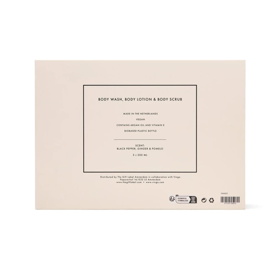 Zestaw kosmetyków 3 el., w komplecie: żel do mycia ciała 200 ml, balsam do ciała 200 ml oraz peeling do ciała 200 ml, ciepły aromat czarnego pieprzy, imbiru i pomelo, w eleganckim pudełku upominkowym