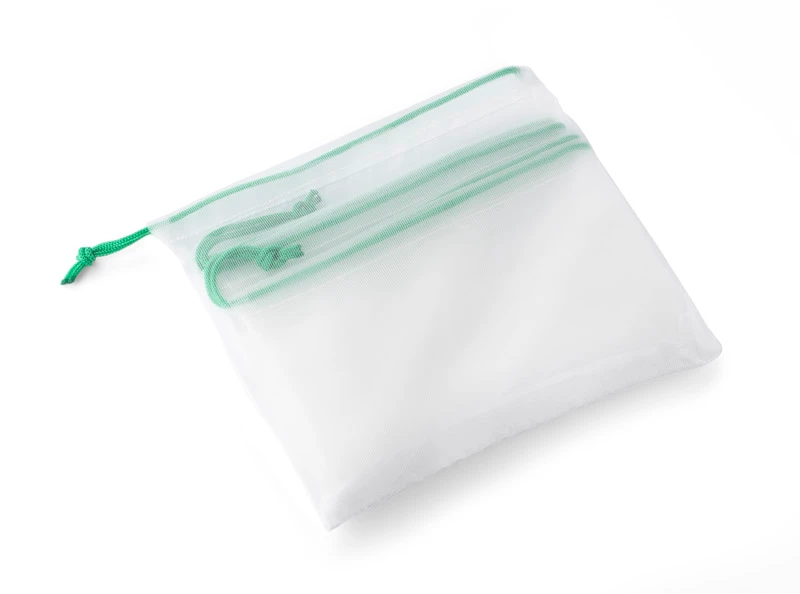 Zestaw worków stanowiący zakupowy niezbędnik w dzisiejszych czasach. Wykonany w idei "less waste" z recyklingowanego poliestru. Zestaw składa się z 2 większych worków w rozmiarze 320 x 340 mm oraz jednego mniejszego w rozmiarze 175 x 150 mm, będącego również etui. Mały woreczek z jednej strony jest wykonany z gładkiego poliestru.