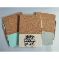 Elegancki notes łączący naturalny korek z płótnem. Rozmiar A5, 80 kartek w linie (gramatura 70 g/m2). Wyposażony w długopis wykonany z korka, słomy pszennej i PP. Pakowany w pudełko.