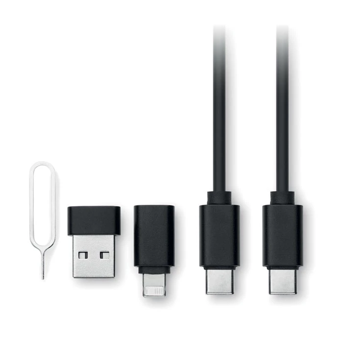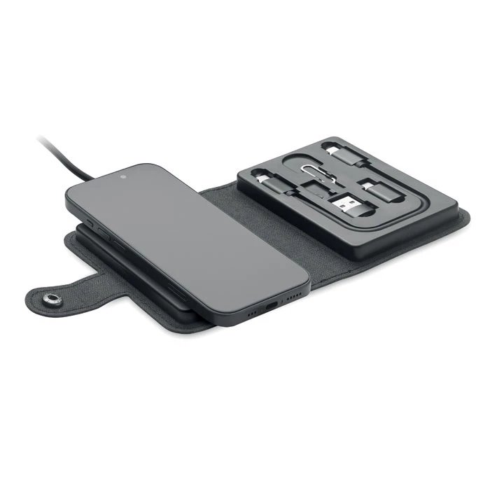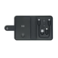 Zestaw kabli z ładowarką bezprzewodową 15W i ładowarką do zegarka (tylko Apple®). Kabel ładujący 4 w 1 z narzędziem do wysuwania kart. Pokrywa z PU + RPET pochodzącego z recyklingu, plastik ABS pochodzący z recyklingu i aluminiowa płyta pochodząca z recyklingu.