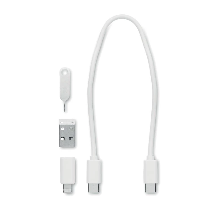 Zestaw kabli i złączy 9 w 1. Kabel do przesyłania danych i zasilania (480 Mb/s): Typ-C do Typ-C. Adaptery: Type-C do Type-A i Type-C do 2-w-1 <(>&<)> micro-B. Kieszonki na kartę Micro i Nano SIM. Trzpionek do wysuwania kart SIM.